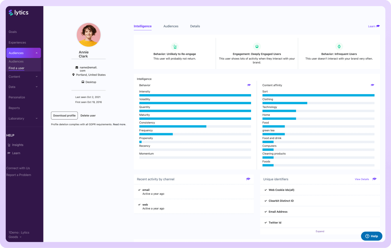 Lytics state-of-the art identity resolution merges users behavior across channels to form one unified customer identity. Now, you can capture every interaction a user has with your brand and stitch together comprehensive profiles that stay healthy, accurate, and complete over time.