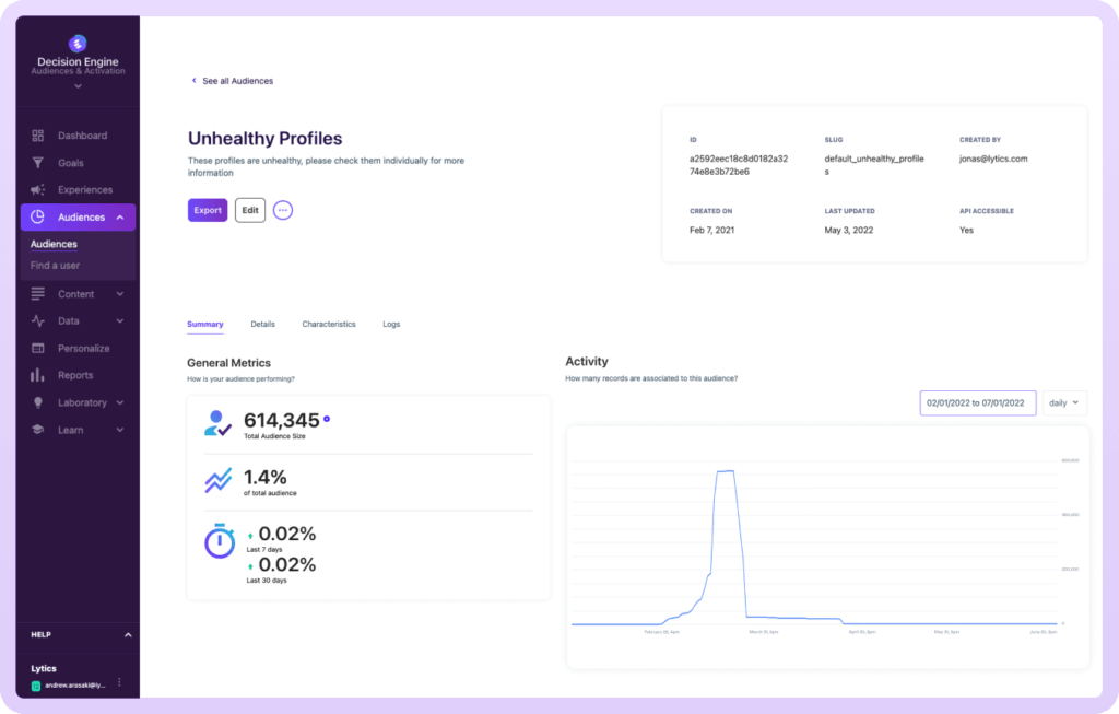 When it comes to identity management, achieving a unified Customer360 view is just the beginning, not the goal. With one-of-a-kind self-healing identity management capabilities, Lytics has safeguards in place to prevent over-merging, under-merging, and improve profile stability , so you can rely and act on your customer data with confidence.