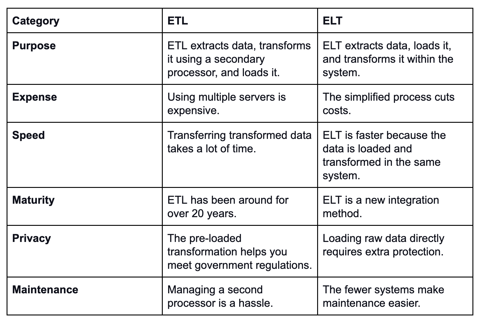 With ETL, you transform data while moving it. But with ELT, you transform data after the moving process. Each integration method has advantages and disadvantages. Both are different from reverse ETL, which you can learn more about here.